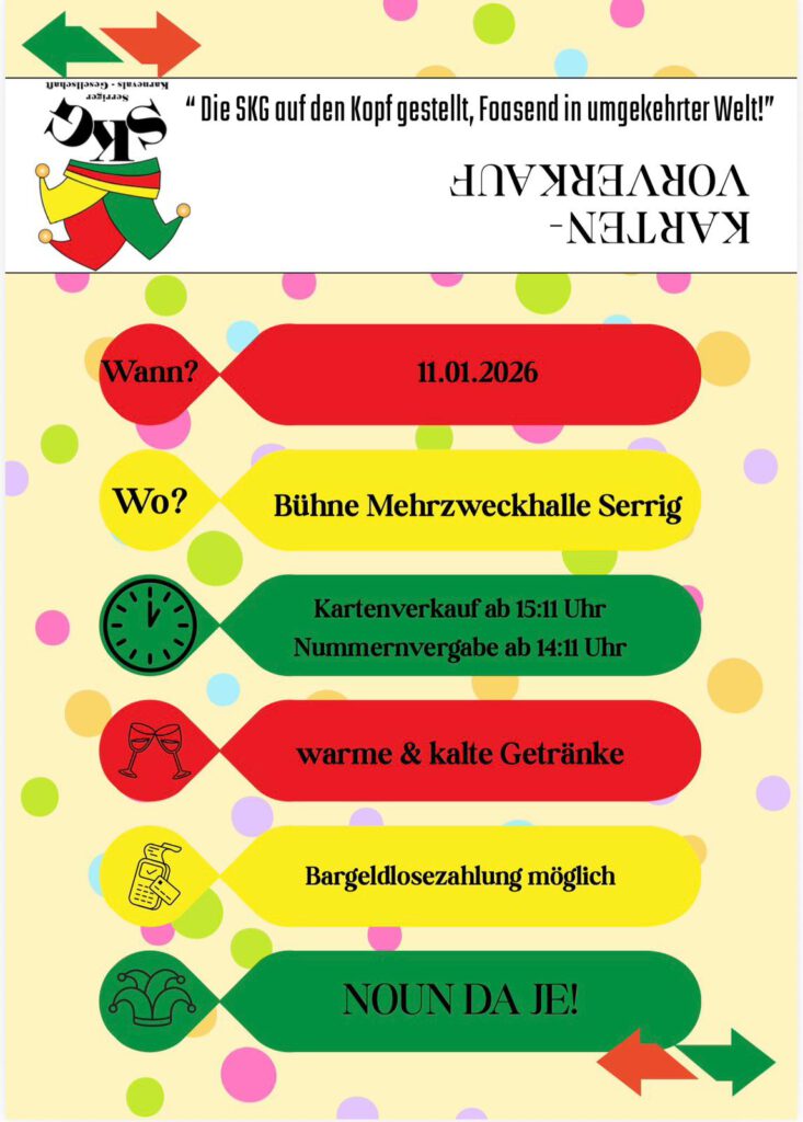 Am 11.01.2026 um 15:11 findet der Kartenvorverkauf der Serriger Karnevalsgesellschaft auf der Bühne der Mehrzweckhalle statt. Für Heiß- und Kaltgetränke wird gesorgt.